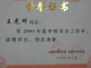 我校安全保卫干部王光辉被成都市教育局和成都市安监局评为“先进个人”