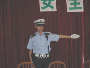 2004年9月8日下午,我校特别邀请了成都市交警五分局一大队交警、我校校外法制辅导员李勇警官和张林警官,给我校高2007级学生进行了交通安全讲座,并且发放了宣传资料。李警官就新的《道路交通安全法》系统地、全面地向学生作了讲解,张警官还向学生表演了标准的交通手势。