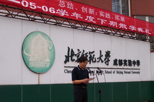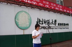 2006年7月4日上午,北师大成都实验中学在操场举行了2005—2006学年度下学期散学典礼,全校师生员工参加了散学典礼。 学校校长刘增利首先发表讲话。刘校长指出:我校今年中、高考成绩再创佳绩,特别是参加中考的学生上重率达50%,最高分588分,超重点线93分,有2位学生中考成绩进入成都市前50名。刘校长要求全校师生员工再接再厉,使我校各项工作再上一个新台阶。 学校安全保卫干部王光辉进行了假期安全教育,对全校师生员工提出了假期安全要求,要求各位同学假期要注意交通安全、人身安全、食品卫生安全,要注意用电、用气安全以及防火、防盗,要注意游泳安全,不私自下河游泳。最后,教育处副主任杨永东宣读了2005—2006学年度下期三好、优干、文明生名单。 |
