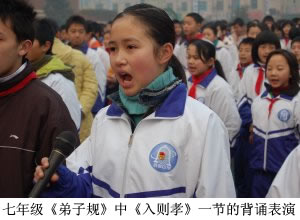 | 2007年1月29日上午,我校举行了以“建和谐校园,促学校发展”为主题的散学典礼。在散学典礼上,刘增利校长对本学期的各方面工作进行了总结,并勉励全校学生:要做一个孝敬父母的人,做一个受欢迎的人。初一年级学生进行了传统文化《弟子规》中《入则孝》一节的背诵表演,让“孝”——这个中华民族的传统美德深入每个学生的心灵,朗诵时整齐而又抑扬顿挫,节奏明朗而又不乏古人之气质,让整个校园沉浸在传统文化的氛围当中,对全校师生思想和心灵都有了极大的震动。最后对本学期各年级涌现出的三好学生、优秀学生干部、文明生、学生会团委优秀干部、文明住校生、优秀室长等进行了表彰。 | |