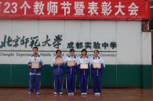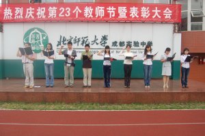 2007年9月10日,我校举行了庆祝第23个教师节暨表彰大会。学生代表发表了充满热情的教师节感恩演讲,30多位学生向老师一一献上了代表关爱和尊敬之意的康乃馨。8名新老师在成都市师德先进个人刘明俊老师的领誓下、在1500多名学生面前进行了教师职业道德宣誓仪式。会上还对5名优秀直升生进行了表彰。