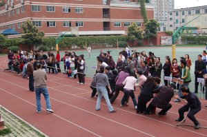 4月3日下午,我校全体教职工齐聚操场,举行了迎奥运趣味体育运动会。工会主席杨延凤书记在开幕式上致辞。在运动会中,教职工进行了拔河、跳绳、踢毽子的比赛。