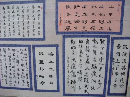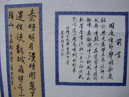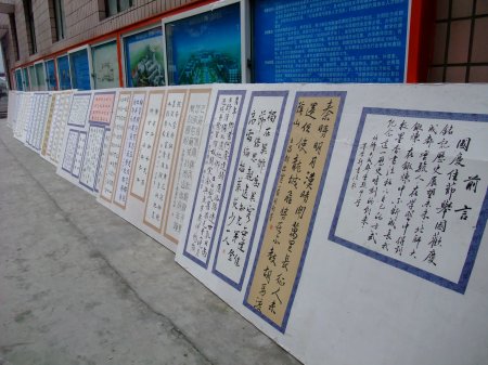 为了庆祝建国59周年,北师大成都实验中学书法社组织展出了社团书法作品。此次活动得到同学们的积极响应,共征集到书法作品60余幅,从中精选了近40幅展出,吸引了临时教学点众多的学生、工作人员参观,取得了良好的效果。此次活动负责人余华忠老师表示,今后还将更多的组织此类活动,为书法社的同学们搭建更多的展示平台,也希望通过这种展示,激发全校学生热爱学习传统文化的积极性。