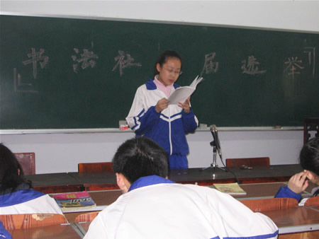 2009年3月16日中午,我校翰墨轩书法社进行了领导班子换届选举。我校书法社成立于2007年4月,距今近两年,组织进行了三届我校的“迎新杯”书画大展赛,多次组织参加了校内其他主题的书法展。多次参加了国内外书法大奖赛,并获得了很多名次。本次换届选举通过民主投票,选出了社长苏天月,副社长郭媛媛,秘书长王伟鉴,副秘书长刘和畅,任期一年。