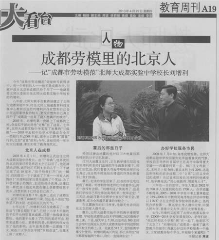 4月28日,《成都日报》以“成都劳模里的北京人”为题报道了“成都市劳动模范”、我校刘增利校长扎根成都教育的工作事迹。