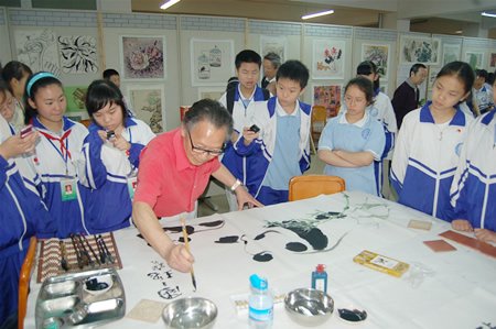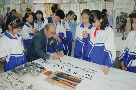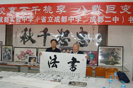 6月5日上午,我校举办了第三届书画界校友笔会,近三十位著名书画家校友齐聚一堂,现场作画挥毫,祝愿母校明天更美好。来自学校的四十余位学生书画爱好者和老校友欢聚一堂。校友中不少大师级的名人惹人眼球:国画大师邱笑秋、张幼矩,曾为中南海画过牡丹的“邵牡丹”邵仲节,全国知名漫画家白士林,书法大师李树荣、刘允奇等。其中年龄最大的书画大家殷茀康老先生,已经88岁,回忆起自己三十年代的在校生涯,这位老人家显得很兴奋和感慨。 上午10时,笔会活动正式开始。刘增利校长到会致欢迎词。交流中最先发言的白士林带来的一样东西让现场的同学们受到很大的教益:他拿出自己当年的一个临摹画册,该画册只有一般的工作笔记本大小,临摹的是三国人物,纸张则是各种香烟纸做成的。“这是我1957年的临摹本,几十年了,这个本子一直都保存着。同学们,只要你们能坚持,你们就一定能成功……” 笔会现场四周挂满了同学们近期的书画创作作品,两年前曾带领百位在校学生外出写生采风的何自立校友在细细观看了学生们的作品后感叹到:“这两年学生整体水平提高很快啊,现在的作品真得拿得出手了……下次我们还要组织学生走出去,多锻炼!”同学们还带上自己的作品找老校友们一一指点,听取大师们作画、写字,乃至做人的感悟体会。 09年我校毕业的书法特长生,现就读于西南财大的杨孟凯同学,听闻召开笔会,也特地赶回母校,同老校友们同场献艺,祝愿今年高三的同学们取得好成绩。 |