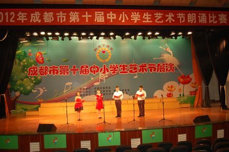 2012年5月16日,我校由章继广老师带队指导,李伟、王瀚奇、杜晓峰及石一杉同学在双流棠湖外国语学校参加了成都市第十届中小学生艺术节朗诵比赛。