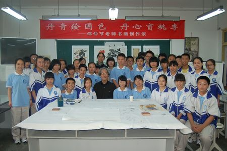 全国著名花鸟画家、美术教育家、中国牡丹画第一人、我校退休教师、86岁高龄的邵仲节先生,2012年6月6日下午,回到学校,与全校30余位书画爱好者进行了“书画创作漫谈”活动。 书画延年。邵老虽已年高,但精神镌烁。 大音无声。邵老成绩斐然,却和蔼可亲。 面对初高中书画爱好者,邵老殷殷嘱咐:“画画要求,不仅要画美,而且还要有情,要把自己对美术的融入其中”。“画画不仅要用手,还要用脑。要将画与诗结合起来,这便是诗情画意了。” 邵老寄望在场的爱好者: “少年书画爱好者,应当从小立志成‘家’、长大才能报效国家”。 应在场的书画爱好者的请求,邵老为大家现场作画。一张宣纸、一方淡墨,提提按按、笔锋微转,瞬间绘就出栩栩如生的国色牡丹,那角上的蝴蝶活灵活现。不知谁在惊叹,这不是“蝶恋花”吗? 虽然时间已一个多小时,为释疑解惑,邵老详尽地回答了小学友们提出的各种问题,并为最近在“木铎韵彩”书法美术作品大赛中,获得全国奖励的三位同学的作品,提出了修改意见。 时间过得真快,这场酣畅淋漓的讲座不得不进入尾声。同学们愉快地请邵老留影纪念。这群忘年之交的画友约定:在下次“邵仲节艺术研究会”的会务活动上再见! |