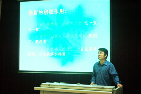 【学生处 讯】2012年9月19日星期三下午熊继刚、阙楠老师在阶梯教室开展了以“生命教育”为主题——在班会课中渗透心理健康教育的班会课。此次课题两位老师都结合了身边的案例,课堂生动活泼,意义深刻。由此,拉开了2012-2013学年度(上期)以“生命教育”为主题——在班会课中渗透心理健康教育的班会课献课序幕。 熊继刚老师以《面对挫折,学会坚强》使学生了解挫折在人生路上的不可避免性;提高挫折承受力,掌握对待挫折的正确方法。使学生树立信心,让挫折成为自己向上攀登的垫脚石,在遭遇挫折时,能善待挫折,努力战胜挫折,做生活的强者。 阙楠老师以《有一种美丽叫自信》使学生从“隐形翅膀,伴我成长”“华丽转身,寻找自信”等方面全面了解自己,例举乔治.赫伯特、邰丽华、博尔特、班里同学等等的故事层层深入,加入了增加自信的小技巧和同学们在生活中没有自信该怎么做。树立了同学们的自信,让自信伴随他们成长。 本学期共有19位老师参加“生命教育”为主题的班会课献课,期待老师们和同学们精彩的表现! |