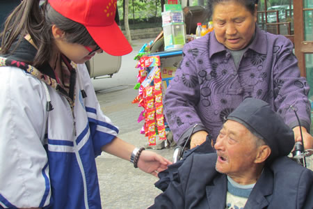 2012年10月23日中午,我校志愿者服务队5名学生志愿者、袁野老师、东较场社区肖主任、社区工作人员一同前往社区退休老党员陈大爷家中慰问,并到1号桥的小摊贩点看望了瘫痪的张炳金老人,为两位空巢老人送去重阳节的祝福。 同学们带上水果牛奶等慰问品,到两位大爷家中与他们聊天,关心老人的生活,和老人们谈学习谈理想,还一起扶着瘫痪的张大爷走了一小段路。两位老人都留下了感动的泪水,最后同学们离开时,老人们依依不舍的叮嘱同学们一定要好好学习,同学们也表示以后的节假日一定会常常来看望陪伴两位老人。 本次重阳节敬老爱老活动,让同学们感受到空巢老人的孤单,体会到他们需要关爱的心情,从而真正的学会了如何去关爱帮助老人。 为大力弘扬“学习雷锋,奉献他人,提升自己“的志愿服务精神,我校进一步加强了学生志愿者服务队的建设,将学校志愿服务活动由以阶段性为主向经常性活动转变,志愿服务管理由松散型向规范型转变。今后学校还将继续组织定向定点的社会实践和志愿服务活动,加大建立实践基地的力度,倡导和支持孩子们自我服务和自我管理,努力实现孩子们的自我教育和自我发展。 |