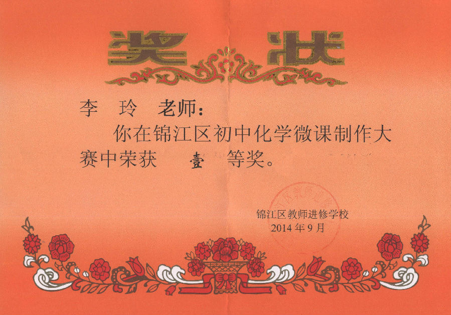在刚刚结束的锦江区化学微课制作大赛中,我校青年教师李玲制作的微课视频一举夺得一等奖,受到了锦江区教师进修学校的表彰。李玲老师在微课制作中的获奖为我校在微课制作中开了一个好头,必将对我校的现代教育技术的应用起到促进作用。