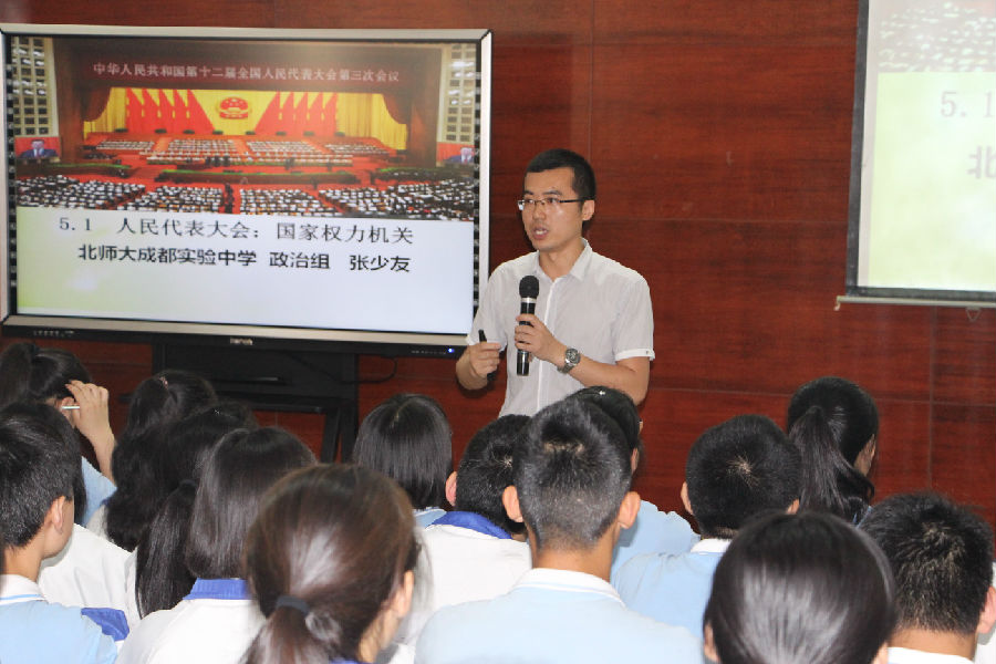 14日上午由北京师范大学基础教育对外合作办学部常务副部长刘增利校长作简短的开班致辞后,由北京市特级教师,国培专家梁侠老师作了“中学德育课程教学设计”的专题讲座,深入浅出,幽默风趣,贴近政治课堂和政治教师的发言引来老师们阵阵会心的笑声。15日由成都七中刘金宝老师、我校王健洪和张少友老师为大家准备的观摩课为老师们带来政治课堂创新的体验。梁侠老师和成都市教研员吴登良老师的点评更是画龙点睛。我校政治教研组组长吴鸿与与会老师进行了教研组建设分享。