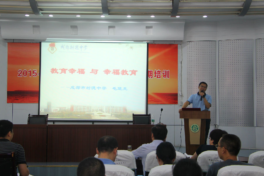 8月21日上午,树德中学光华校区执行校长毛道生以《教育幸福与幸福教育》为题,从教育是为了众人的幸福;教师要体验教育的幸福;教师要彰显教育的幸福三个方面,用一个个精彩的教育故事与大家分享了树德中学的幸福教育。毛校长说:“体验教育的幸福要不以物质的获取和工作的轻松为标准;体验教育的幸福需要有直面困难和冲突的勇气和决心;体验教育的幸福不以结果论英雄,而在于过程的体验;体验教育的幸福要不断挑战自我,全力追求专业发展;体验教育的幸福要致力于教师非专业生活走向情趣化。”幸福的教育不但要由幸福的教育人来进行,还要通过人性的、艺术的教育来让学生体验幸福,品味幸福和享受幸福,实现“教师幸福地教,学生幸福地学”。毛校长认为教育幸福必须以发自内心地爱学生为前提;以谋求学生长远发展为基础;以科学艺术施教育人为保障。所以“教育,一切为了幸福!”