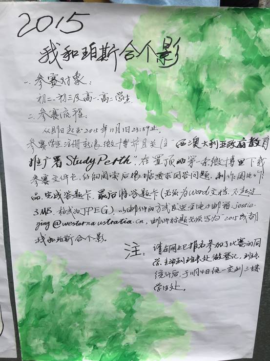 “我和珀斯合个影”,这是我们十月初就给大家推出的活动,相信大家都在各班看到了通知,小编在此提醒,交稿日期快到了,大家要尽快准备哦