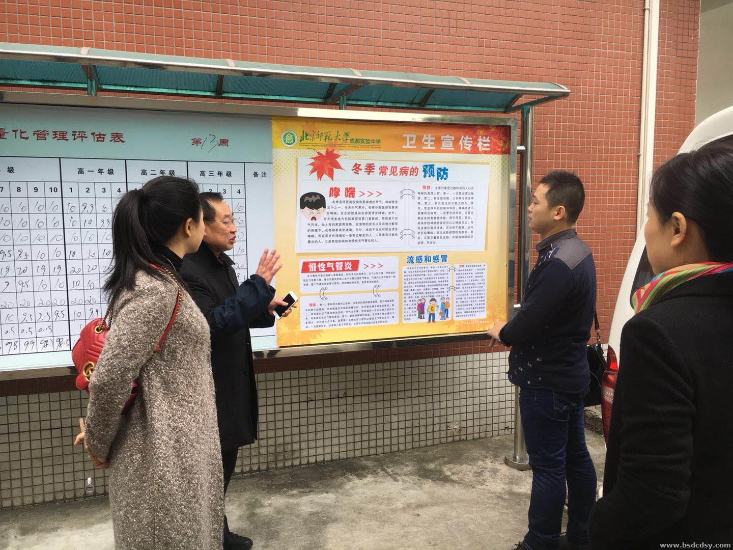 【徐莉 讯】为切实加大学校结核病防控力度,有效防范学校结核病疫情的发生和流行,2017年12月1日上午,锦江区、成都市多部门(锦江区卫生局、疾控中心、卫生执法大队、市教育局、市卫生局、疾控中心)相关负责人,在张文勇副校长、蔡怡主任、学生处李国金老师及两位校医的陪同下,对我校的卫生工作、特别是结核病防控工作进行全面检查。包括教室、宿舍、食堂、办公室、学生教师的生病情况、宣传(教育)、应急预案等进行全面检查。