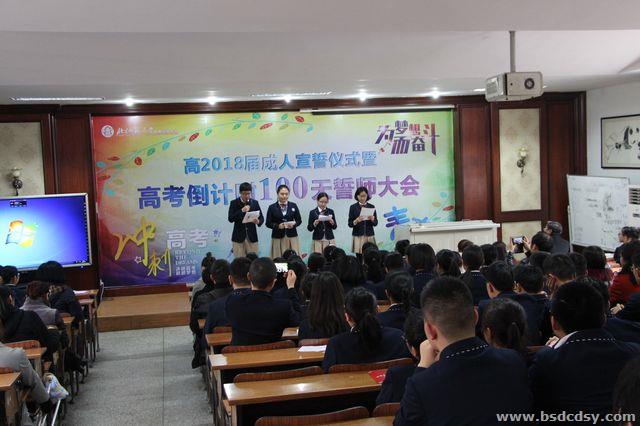 2018年2月27日下午4点,我校高2018届成人典礼暨高考倒计时100天誓师大会在阶梯教室隆重举行。刘增利校长、范黎副校长、高三年级主任周玉英老师、全体高三任课教师及部分家长代表出席了此次大会。
