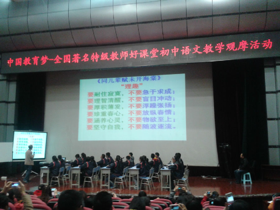 322日、23日由北师大教育培训中心主办的“中国教育梦——全国著名特级教师好课堂初中语文教学观摩活动在重庆召开,我校语文教师顾一萍、陈敏、吕琼梅、刘琢四人前往观摩、学习。全国著名特级教师徐杰、韩军、赵谦翔、黄厚江在现场都进行了示范课展示,并结合自己研究初中语文教育的心得分别做了“教材处理的原则、方法和艺术”“新语文、新课标与高效课堂”“绿色语文诗歌鉴赏”“语文教学的本色追求”的专题讲座。示范课上,特级教师们扎实与娴熟的功底、游刃有余驾驭课堂的能力让人佩服不已,所带来的专题讲座理论高屋建瓴,令人有如沐春风之感。高山仰止,景行行止,虽不能至,然心向往之。观摩学习后,我校语文教师都备受鼓舞,希望把名师的先进教育理念与自己的实践相结合,打造属于自己的高效课堂。