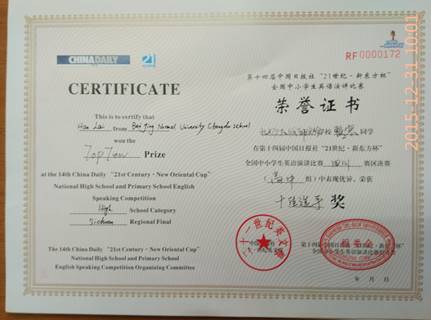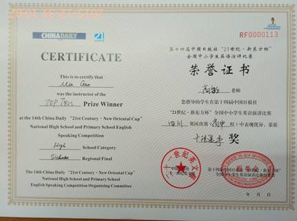 2015年12月26日至27日,经过了三个多月的激烈的角逐,第十四届中国日报社“21世纪·新东方杯”全国中小学生英语演讲比赛(四川赛区)的决赛在电子科技大学沙河校区圆满落幕。我校高三学生赖寒在强手如林的第14届中国日报社“21世纪•新东方杯”全国中小学生英语演讲比赛四川赛区高中组的决赛中,面对成都、绵阳等地的各路高手,以优异的表现获得了十佳选手的殊荣。赖寒与指导老师高敏同时获得了主办单位中国日报社和新东方教育科技集团的表彰。我们谨向赖寒同学和高敏老师表示祝贺。