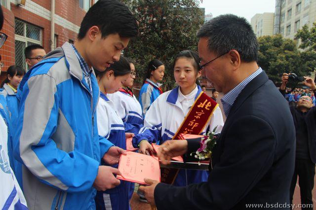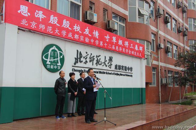 奖学金管理代表四川大学校长助理梁斌教授讲话,并逐一为获奖者颁发获奖证书。梁教授在讲话中特别谈到,闵恩泽先生虽然离开了我们,但是恩泽精神永远鼓舞着我们。闵恩泽先生留下的不仅仅是他的事业,不仅仅是他的奖学金,更是留给了我们宝贵的做人的榜样。梁教授还希望,我校师生记住闵爷爷的期望,在学习中倍加努力,在事业中倍加拼搏,在生活中更加友爱,在人生中更加珍惜,从而创造更加辉煌的成绩,让北师大成都实验中学的发展更加蓬蓬勃勃。