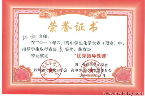 2016年四川省高中学生化学竞赛(预赛)5月如期举行,我校高一高二的部分学生参加了竞赛活动。在此次竞赛中,我校学生表现优异,周持盈等28位同学取得了省级一等奖,张源宁等55位同学取得了省级二等奖,宁尊等37位同学取得了省级三等奖的好成绩。范黎、陈新、陈莉、黄维等四位老师获得了省级“优秀指导教师”的称号的荣誉。四位老师和120位学生均受到了四川省化学化工学会和四川省化学化工学会高中学生化学竞赛委员会的表彰。