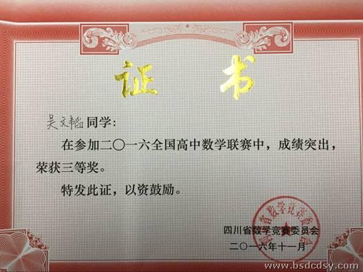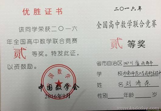 在2016年全国高中生数学联合竞赛中,我校选拔参赛的刘涛荣同学获得全国二等奖,受到中国数学学会的表彰;吴文韬同学获得四川省三等奖,受到四川省数学竞赛委员会表彰。指导教师李红娟老师获得优秀指导教师的称号,受到四川省数学竞赛委员会表彰。张云飞等8位同学获得成都市一等奖,罗石林等12位同学获得成都市二等奖,周科宇等16位同学获得成都市三等奖。李红娟、敖德兵、万羽、刘林、张健等五位老师获得指导教师奖。