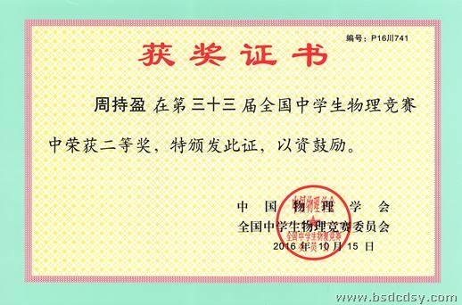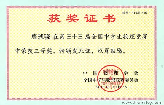 在物理教研组精心组织下,我校高二、高三的部分学生参加了2016年第33届全国中学生物理竞赛。通过参赛学生的努力,共获取46个等级奖,取得了丰硕的成绩。高寒、周持盈等两位同学摘取了全国二等奖;陈好迪、唐琥骁、张瀚宇等三位同学获得了全国三等奖;周科宇等四位同学获得了四川省一等奖;闵云皓等七位同学获得了四川省二等奖;李昊洋等十位同学获得了四川省三等奖;李浩燊等二十位同学获得了成都市一等奖。物理老师何波、李晓丽、谷显露获得优秀指导教师奖。