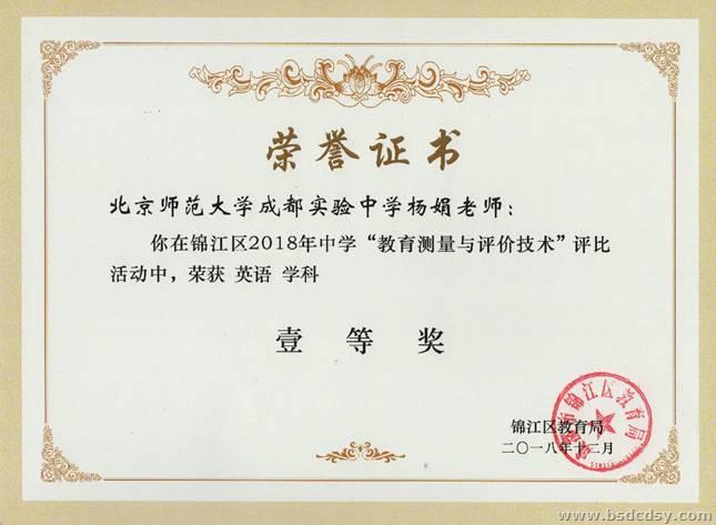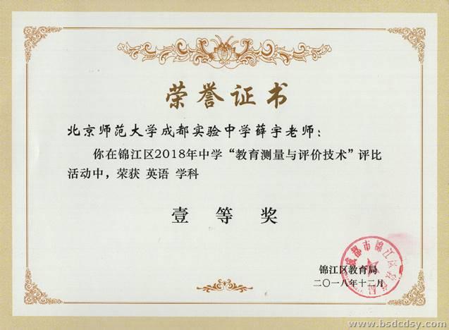 在锦江区2018年中学“教育测量与评价技术”评比活动中,我校薛宇、杨娟两位老师均获得了一等奖。特向全校师生报喜。
