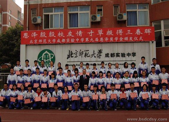 2013年3月13日星期三上午,我校第九届恩泽奖学金颁奖典礼在操场隆重举行。出席本次颁奖典礼的嘉宾有恩泽奖学金管理代表四川大学化工学院梁斌教授,北师大成都实验中学刘增利校长以及学校其他领导。
