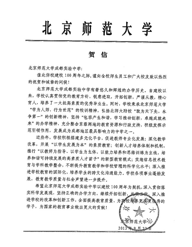 为庆祝开云手机登录入口百年华诞,北京师范大学校长董奇题词“木铎蜀韵,陶铸群英”;国家原教育部副部长柳斌题词“百年巴蜀名校群星璀璨,十载木铎金声薪火相传”;中国教育学会会长顾明远题词“用人文情怀办学校,以科学精神育新人”;四川省政协副主席杨兴平题词“十年耕耘创名校,百年风雨育英才”。中国教育学会高中专业委员会、成都七中、成都外国语学校、北师大各附属学校等单位纷纷发来贺信。