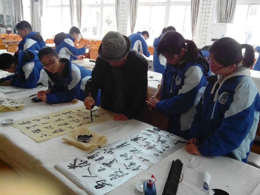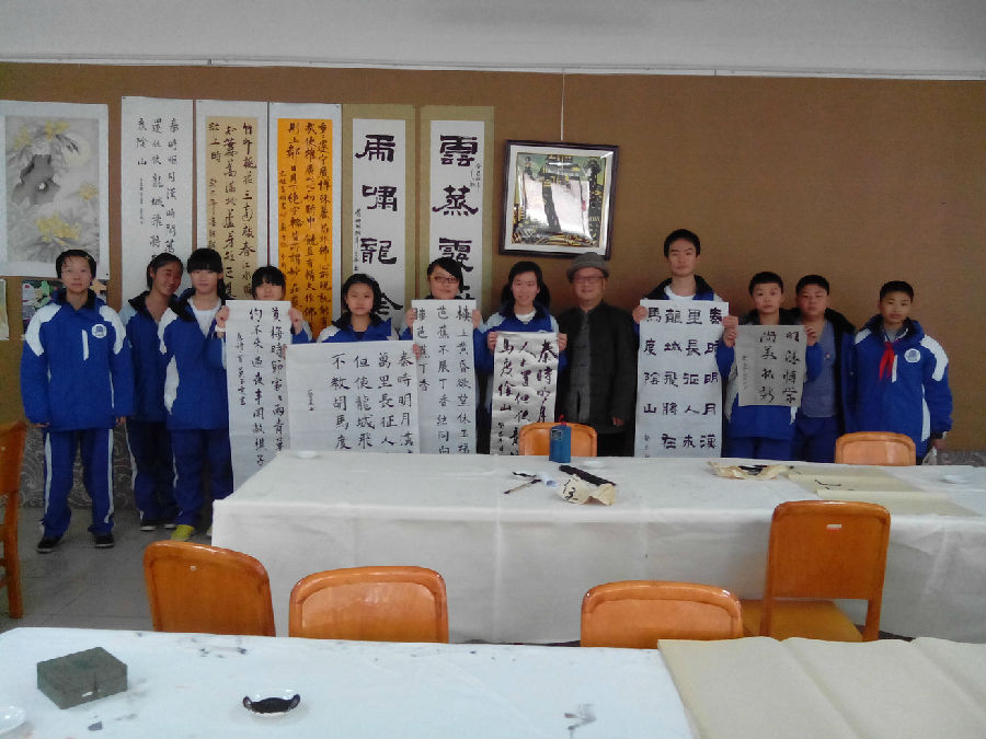 笔会之前,朱映奇老师对同学们现成的书法作品进行了有侧重点评价,指出了社员们书法的优点和不足,并提出了指导性意见,另外还讲了许多书本上很难找到的相关知识。笔会开始后,社员们拿出早已准备好的工具,全心投入到了现场书写,写好的同学相互交流学习,请朱老师进行了指导,朱老师不仅细心指导和点评,还进行了现场书写示范,让社员们都能从中受益。