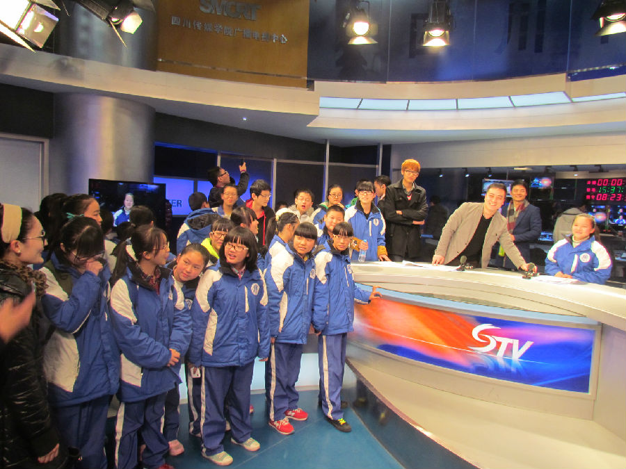 20131129日下午,我校广播站播音员、综合实践播音主持选修课学生一行70余人,在专业辅导老师王紫薇的带领下,带着对播音主持浓厚兴趣,来到位于郫县团结镇的四川传媒学院参观学习。此次活动旨在让怀揣播音主持梦想的同学,对广播、电视播音主持及制作一次亲密接触,让他们去感受去领悟。