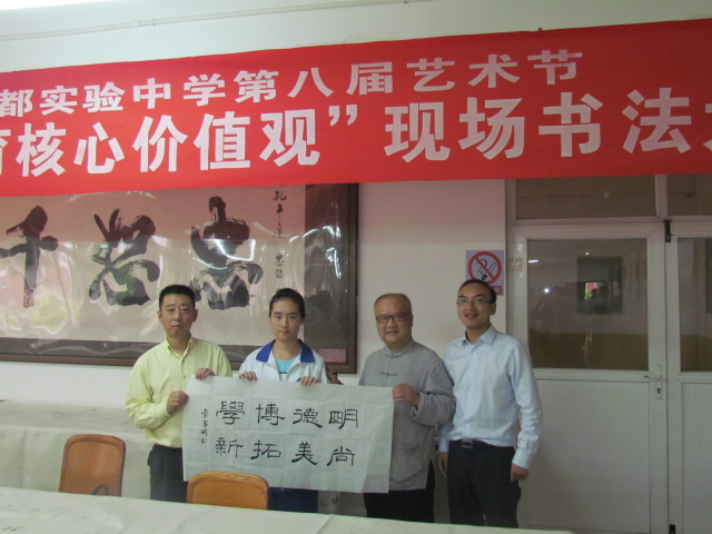 4月24日中午12:50-14:00在我校图书馆,我校举办了“弘扬传统文化,培育核心价值观”现场书法大赛,邀请了四川省硬笔书协秘书长蔺力先生和著名书法家、我校校友朱映奇老师莅临指导。我校刘增利校长和张文勇副校长、敖德兵主任、蔡怡主任、周星释老师、余华忠老师都到现场参观指导。