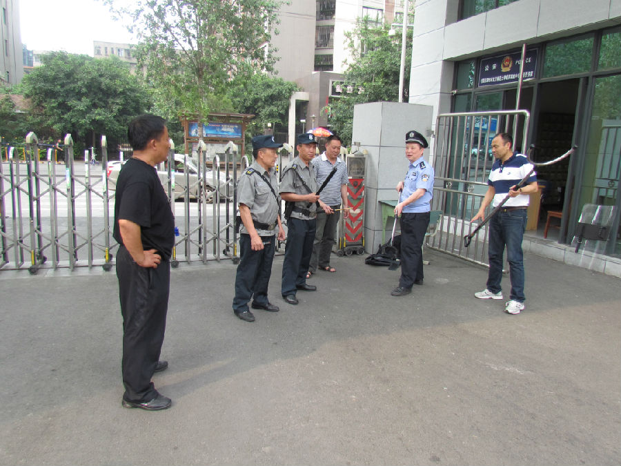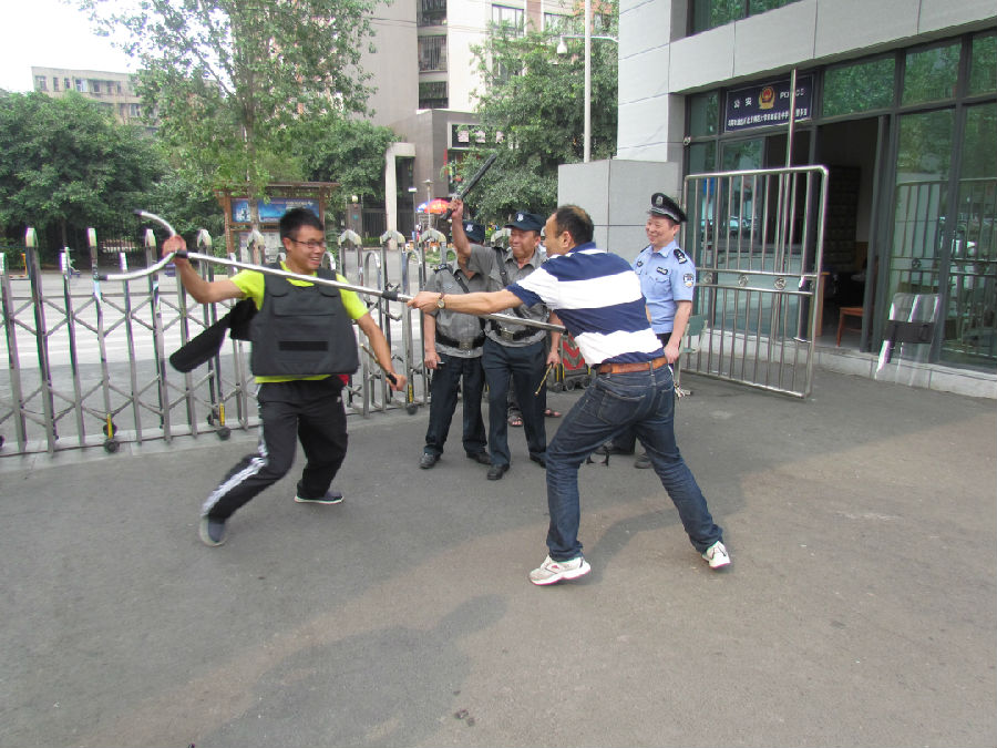 成立仪式结束后,全体成员在校门口接受赵警官如何使用器械的简要培训。