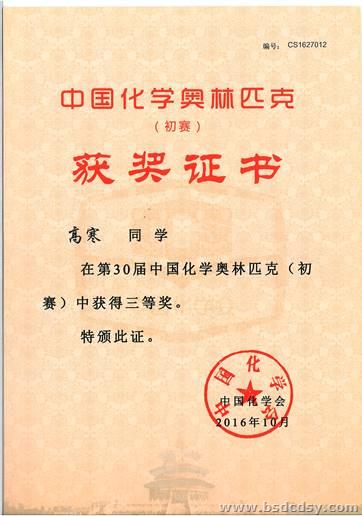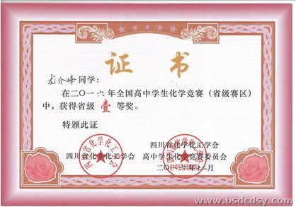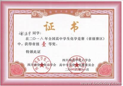 去年8月28日,在陈新、陈莉两位老师的带领下,我校高寒等十二位同学参加了由中国化学学会主办的2016年第30届中国化学奥林匹克初赛,在高手云集的激烈竞争中,通过激烈的比拼,最终高寒同学获得三等奖,得到了中国化学学会的表彰。除此之外,谢浩宇、龙介峰、谢嘉恒等三位同学获得四川省一等奖。周持盈、钟志琦、张雷、王欣等四位同学获得了四川省二等奖,袁祎杰、李昊燊、刘涛荣、王睿杰等四位同学获得了省三等奖,他们都得到了四川省化学化工学会等单位的表彰。陈新、陈莉两位老师也获得了“优秀指导教师”的奖励。