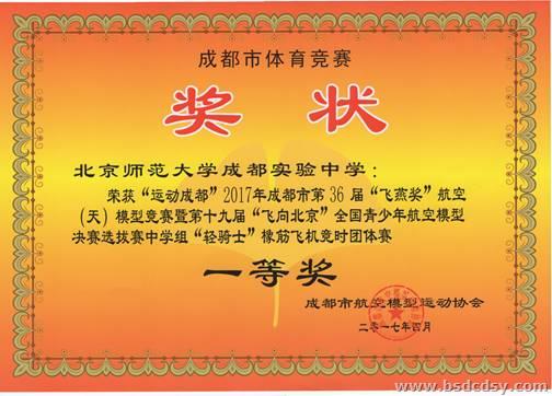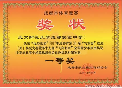 在2017年4月举行的“运动成都”2017年成都市第36届“飞燕奖”航空(天)模型竞赛暨第十九届“飞向北京”全国青少年航空模型选拔赛中,我校凌锡帮老师带领的学生袁明军、林靖超、郭其鑫、于戴临、江昕瞳、黄雨潇、杨丛语等七位同学在参加的七个比赛项目的男子、女子分组比赛中,一共获得第一名12个,第二名2个;以较大的优势一举摘取了中学组橡筋动力直升机竞时团体赛、仿真橡筋动力直升机竞时团体赛、“雷鸟”橡筋飞机竞时团体赛、“信天翁”橡筋飞机竞时团体赛、“红雀”橡筋飞机竞时团体赛、“轻骑士”橡筋飞机竞时团体赛等六个一等奖。七位同学的比赛成绩是:袁明军获橡筋动力直升机竞时赛中学男子第一名和“红雀”橡筋飞机竞时赛中学男子第一名,江昕瞳获橡筋动力直升机竞时赛中学女子第一名和“红雀”橡筋飞机竞时赛中学女子第一名,林靖超获仿真橡筋动力直升机竞时赛中学男子第一名和“雷鸟”橡筋飞机竞时赛中学男子第一名、黄雨潇获仿真橡筋动力直升机竞时赛中学女子第一名和“雷鸟”橡筋飞机竞时赛中学女子第一名,郭其鑫获“轻骑士”橡筋飞机竞时赛中学男子第一名和“信天翁”橡筋飞机竞时赛中学男子第二名,于戴临获“天鹰”手掷飞机直线距离赛中学男子第一名和“轻骑士”橡筋飞机竞时赛中学男子第二名,杨丛语获“信天翁”橡筋飞机竞时赛中学女子第一名和“轻骑士”橡筋飞机竞时赛中学女子第一名。同时组委会还授予了学校优秀组织奖,授予凌锡帮老师优秀辅导员的荣誉称号。
