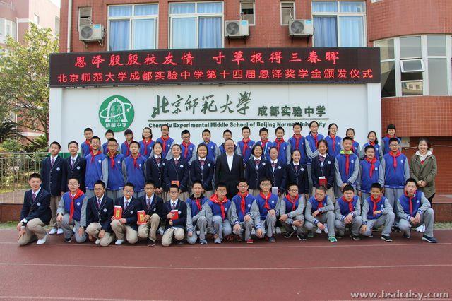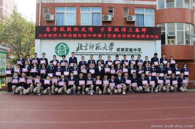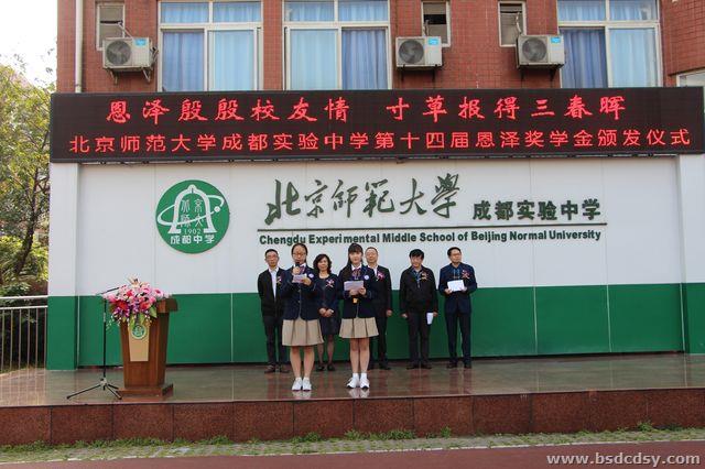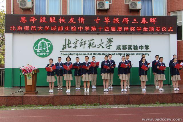 大家好!今天又到恩泽奖学金的颁奖时刻了,今年是第14届恩泽奖学金颁奖,我同北师大成都实验中学的同学们、老师们一样,非常高兴,这是一个值得祝贺的日子。我每年都参加颁奖典礼,我已经成为北师大成都实验中学的一员,非常兴奋、也非常幸福。我们在一起,盘点过去一年我们取得的成绩,祝愿来年的进步。在恩泽奖学金设立的14年中,北师大成都实验中学取得了长足的发展,连续10年获得成都市教育局表彰,去年学校高三毕业生有三分之一被211、985高校录取,一批又一批的同学获得恩泽奖学金,我为学校的发展感到高兴,也为我们这些同学取得好成绩感到骄傲。