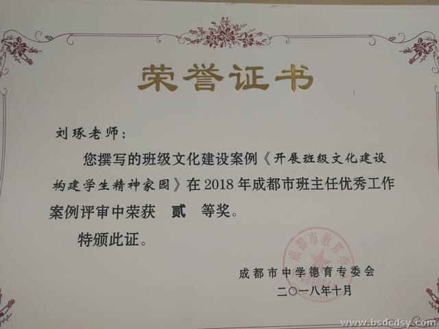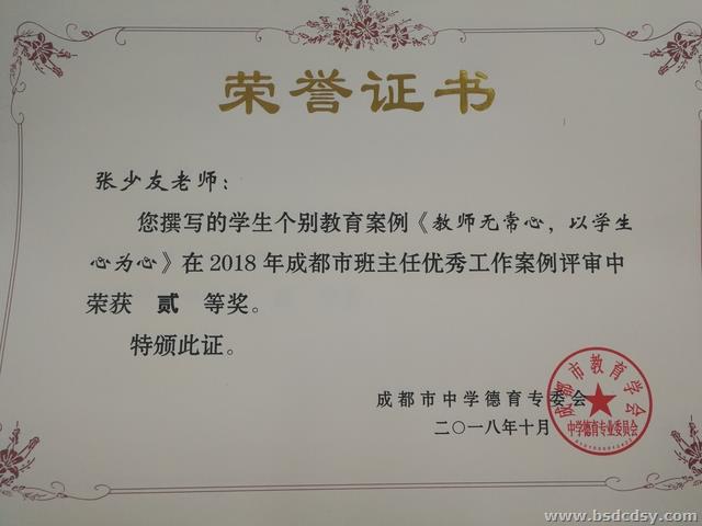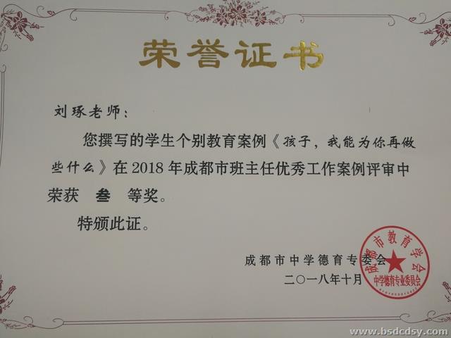 在2018年由成都市中学德育专委会组织的班主任优秀工作案例评审活动中,我校教师的工作案例喜获丰收。具体目录如下: