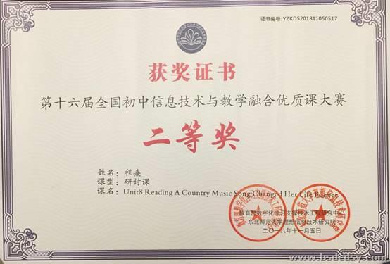 在这次教育信息化方面的盛会中,来自全国28个省、市、自治区的700多位优秀选手共聚一堂,通过研讨课、模拟展示课、观摩课和微课四种课型进行了信息技术与教学融合的有效切磋。在这个一线教师展示才华的舞台上,在这个各地区教师与专家教授沟通交流的平台上,我校程熹老师与广东、浙江、福建等东部发达地区老师在先进技术和前沿理念支撑下就教与学方式的转变进行了较量,与贵州、云南、青海、宁夏等西部欠发达地区老师在利用信息技术提高课堂教学质量和效率的方面进行了比拼,程熹老师按照我校学思课堂的教学理念设计了英语研讨课《Go for it》(八年级下Unit8 SectionB 2a-2e Reading),通过她纯正的英语口音讲解,将课程内容奉献给了大赛。教学设计中恰到好处的信息技术应用有效的促进了教学目标的达成,有效的促进了学生的学和思,获得了专家评委的好评,一举夺得了大赛二等奖。
