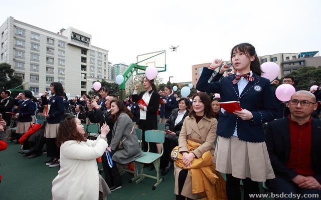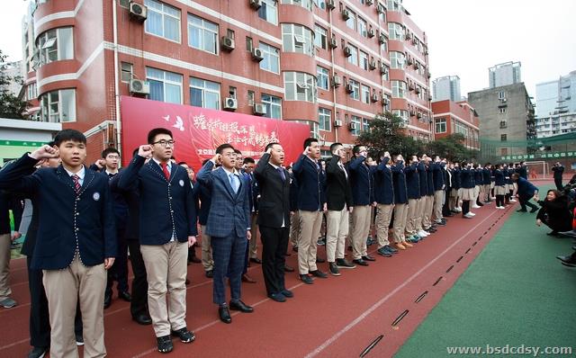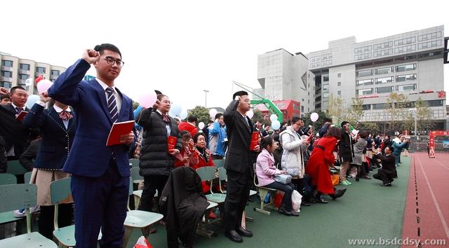 十八而志,学生代表周连浩同学在上台发言中,用关键词的方式表达了他的思考:勇担责任,不摧眉折腰,不随波逐流。最后他用“凝神静气,戟鳞潜翼。斗志昂扬,筑梦远方”开始领誓。全体同学承诺:“肩负使命,心怀重托。挥汗百日,奋力拼搏。自律自强,百炼成钢。分秒必争,言出必行!”至此,高2019届“蟾宫折桂报深恩,玉汝于成铸青春”成人典礼暨高考倒计时100天誓师大会在激昂的誓言中完美落幕。