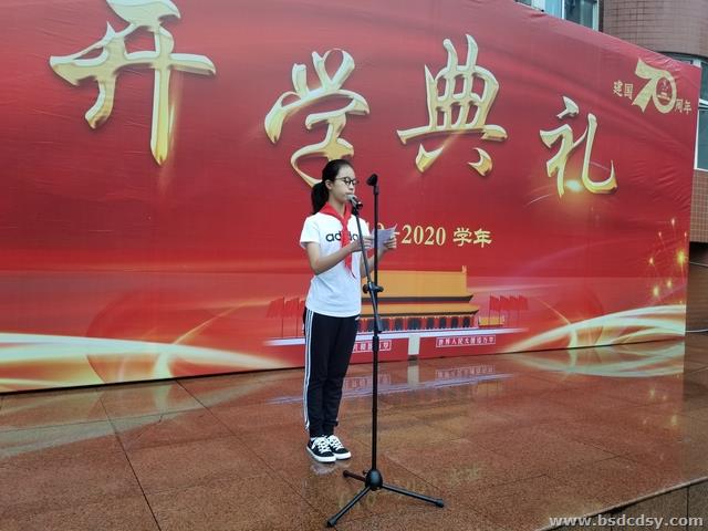 新生代表初一4班罗馨怡同学言语之中无不表达了步入新学校的激动和对初中学习生活的信心。如愿以偿进入了心心念念的学校,她希望像学长学姐一样优秀,为青春、为梦想、为时代、为民族、为中国梦的实现而努力学习和奋斗,她将与所有新生一起,明德、博学、尚美、拓新!
