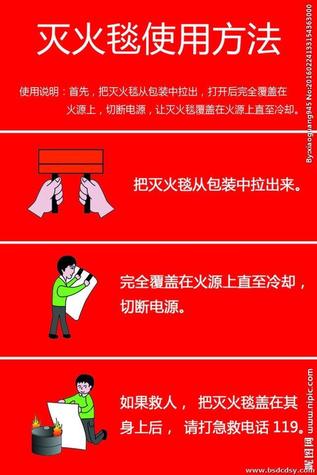 面对一些可以自救的火情,这里交给大家正确的使用干粉灭火器和灭火毯的方法: