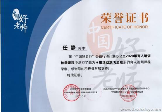 在“中国好老师”公益行动计划办公室2020年育人培训秋季课程录制中,我校任静老师承担了题为《用活动放飞思维》的育人视频课程。任老师用心的课程设计获得专家的好评点赞,北京师范大学教育集团和北京师范大学中国基础教育质量检测协同创新中心“中国好老师公益行动计划办公室联合为任老师颁发了荣誉证书。