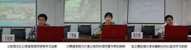 会议期间总务主任王枝国、历史老师兰翠娥、校长助理张文勇等分别就今年暑期外出学习收获进行了交流,与全校教职工一起分享了学习收获。王枝国主任交流了在香港参加中华传统文化研修班学习的点点滴滴,展现了学习归来的国学素养、“温良恭俭让”的精神气质,让人有徜徉于中国传统文化世界里,如沐春风、如浴春雨的妙绝之感。兰翠娥就带领学生参加2013年“苏州府学文化”第十五届国学夏令营进行了交流,分享了品读经典、研习国学、交流经验,感悟传统文化的魅力,增强对中华传统文化的认同感,努力弘扬国学精神的学习感悟。
